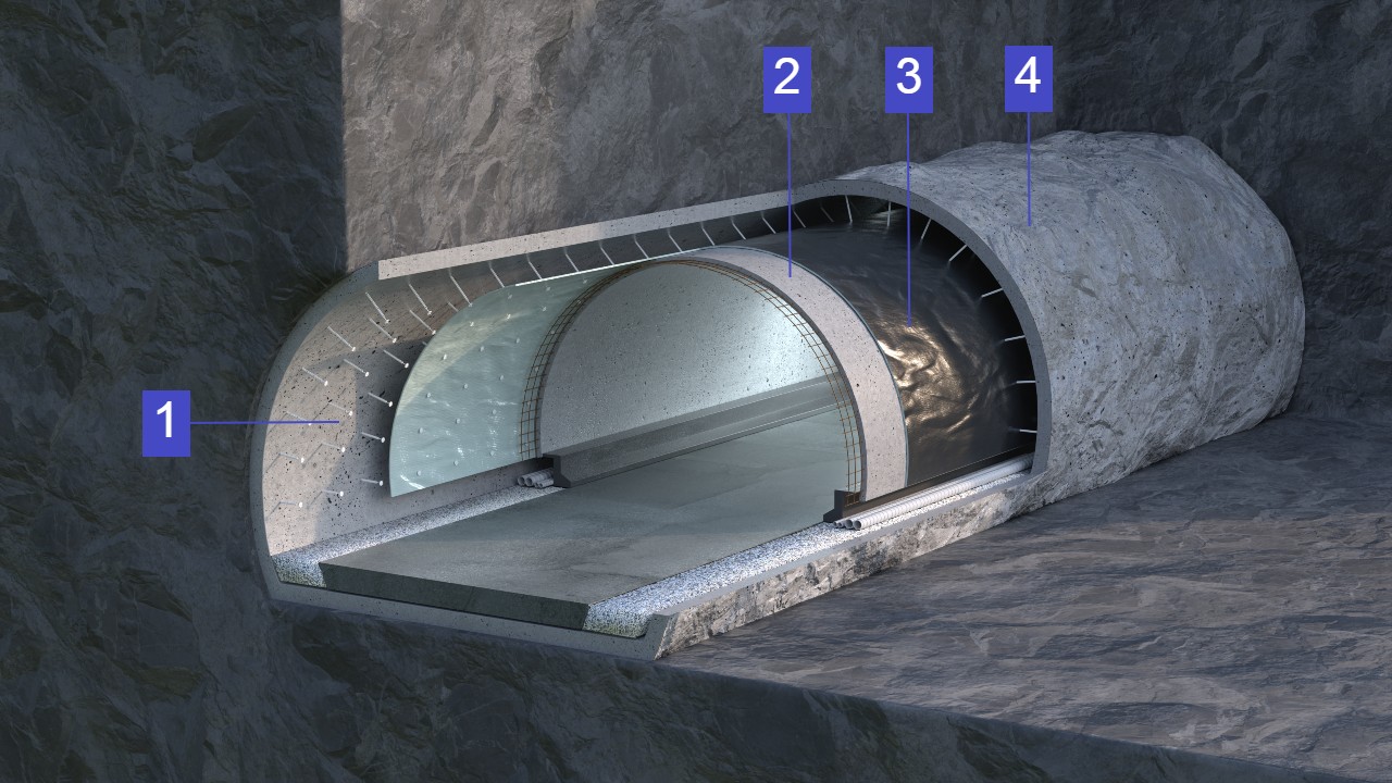The system consists of a waterproofing membrane mounted on an anchor grid, spaced with approximately 50cm to the shotcrete covered rock/mountain. On the inside, towards the traffic, the membrane is either covered with concrete elements or with shotcrete.
